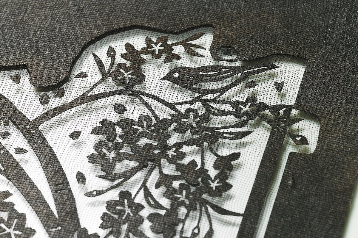 型染めとは切り抜いた渋紙を使って布や紙を染める日本の伝統的な染色技法のひとつです。下絵から型紙を彫り、その型紙と餅米糊を用いて布や紙を染め上げます。型紙を刀で彫ったおおらかで優しい線のゆらぎと、染まる部分と紙の地色のコントラストが凛として美しい作品を生み出します。