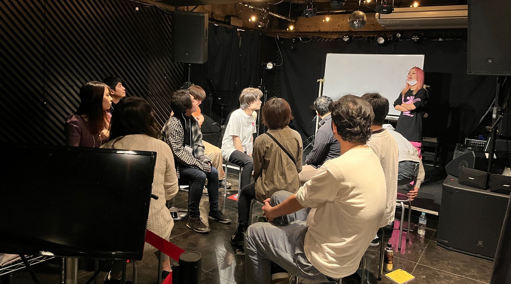 二部制にて実施し、約20名の方にご参加いただきました。会場は小規模なライブハウスで行ったため、参加者と講師のニーコ氏との距離感も近く濃密な90分となりました。