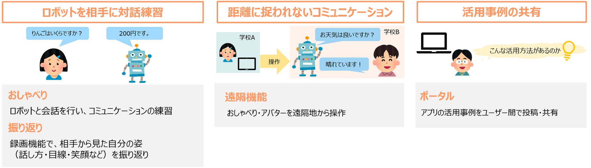 コミュニケーションロボットは、子どもの興味をひきつける授業支援や、自己表現サポートの役割を担い、言葉を話すことによるコミュニケーションが苦手な子どもたちに「できる」という前向きな気持ちを育みます。