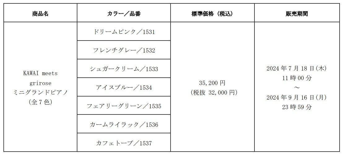 2024年1月~2月に実施した、カワイ直営店・grirose直営店での店舗展示や、コラボレーションミニピアノを抽選でプレゼントするSNSキャンペーンにて大変好評をいただいたため、このたび発売を決定いたしました。