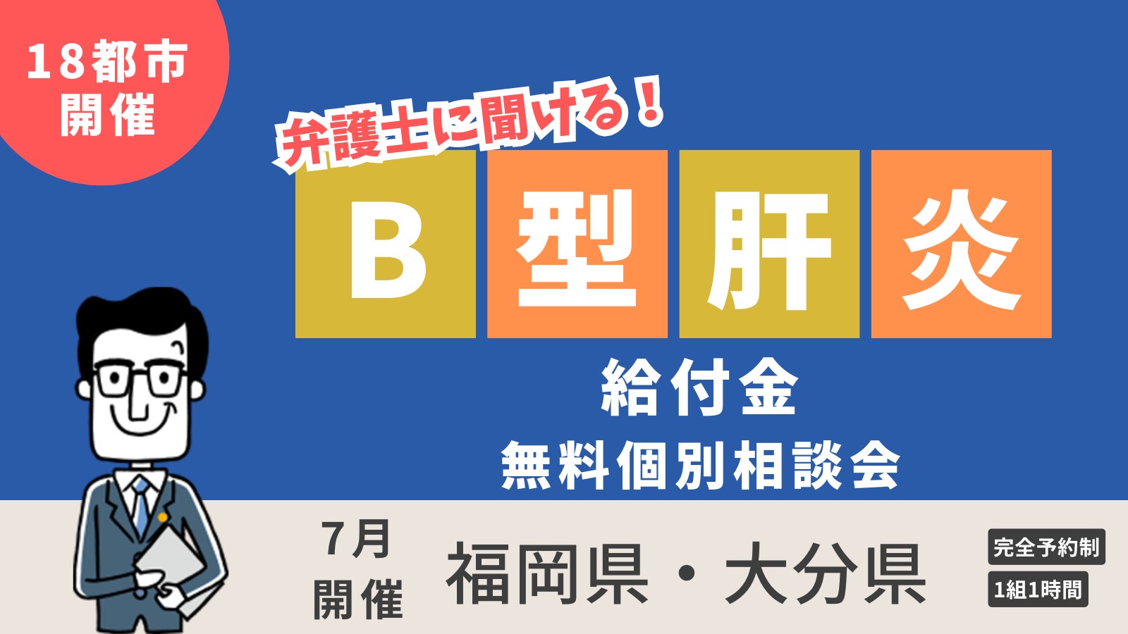 ベリーベスト法律事務所(本店:東京都港区、代表:酒井 将弁護士、浅野 健太郎弁護士、萩原 達也弁護士、HP:https://www.vbest.jp/)は、7月に、福岡県、大分県の18都市にてB型肝炎給付金に関する無料の個別相談会を開催いたします。