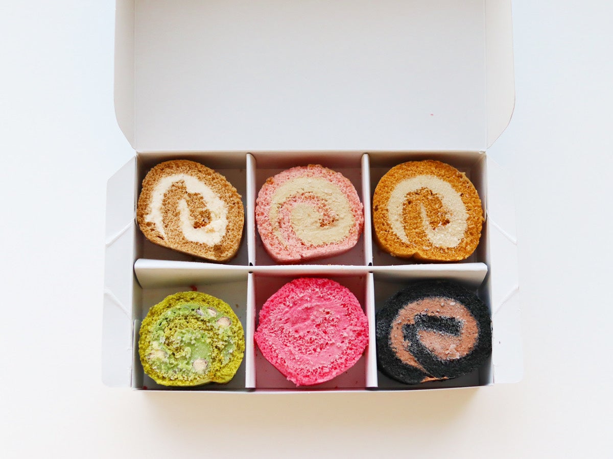 ラズベリー濃縮果汁を北海道産の卵で作るスポンジに混ぜ、さらに果肉入りの濃縮ラズベリーを純生クリームチーズと調合したラズベリー×チーズ味のミニロールケーキ