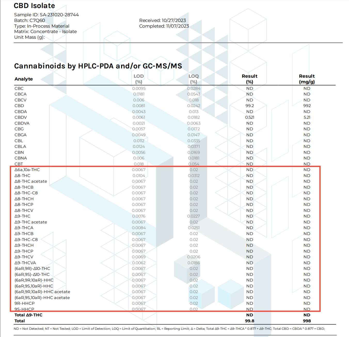 ▼CBDアイソレート原料の分析証明書(COA)※赤枠内が規制されている合成・半合成薬物