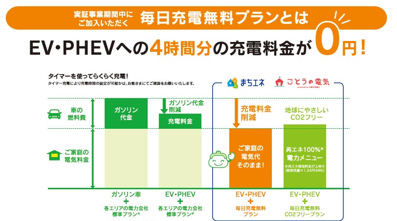 ●電気のご契約を、東北電力・東京電力・中部電力・関西電力・中国電力・四国電力管轄のエリアについては、MCリテールエナジー株式会社が提供する「毎日充電無料プラン」または 「毎日充電無料CO2フリープラン」に、九州電力管轄エリア(福岡県・長崎県・熊本県3県のみ対象)については、五島市民電力株式会社が提供する「従量電灯B」または「従量電灯C」に切替えること。