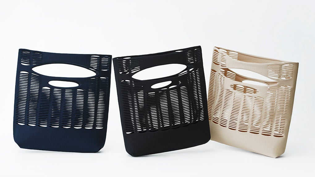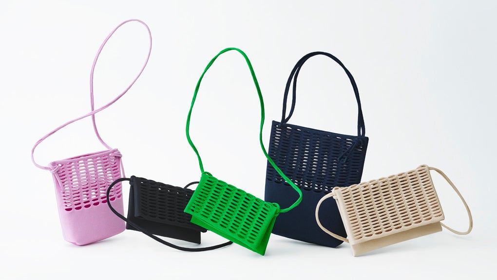 (写真左より)トートバッグ大 ¥27,500、トートバッグ中 ¥25,300、ポシェット ¥16,500、トートバッグ小 ¥19,800、巾着型ショルダーバッグ¥25,300