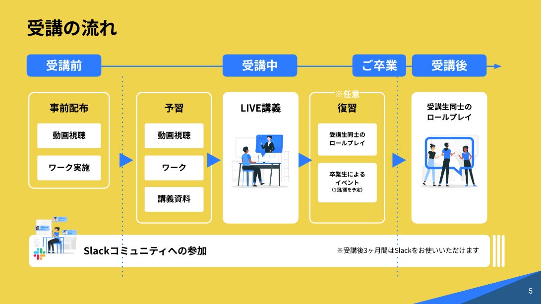 また、講義時間中はアウトプットやフィードバックの時間をメインに行い、即日実践できる形で学んだ内容をお持ち帰りいただけます。
