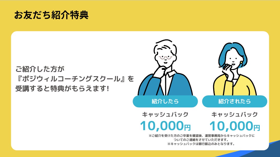 受講生からご家族・ご友人にポジウィルコーチングスクールを紹介いただき、紹介された人がポジウィルコーチングスクールへの受講を申し込むとキャッシュバックの対象となります。