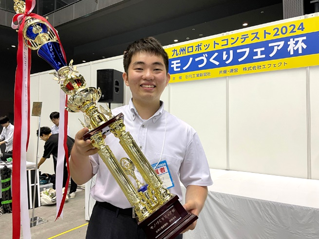 「どこでも誰でも操作できるモノづくりができるエンジニアになりたい」という夢を持って、体が不自由な人も楽しめるネット操作型の小型クレーンゲームを開発。3DCAD設計から3Dプリントや加工まで自ら行い、実機を完成させました。日刊工業新聞社が主催する「九州ロボットコンテスト2024モノづくりフェア杯」で発明のコンセプトやロボット製作の緻密さなどが評価され、見事優勝しました。