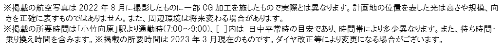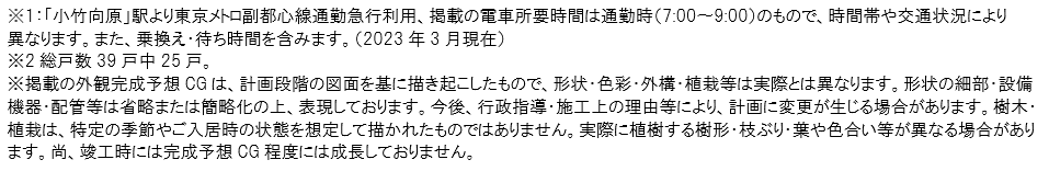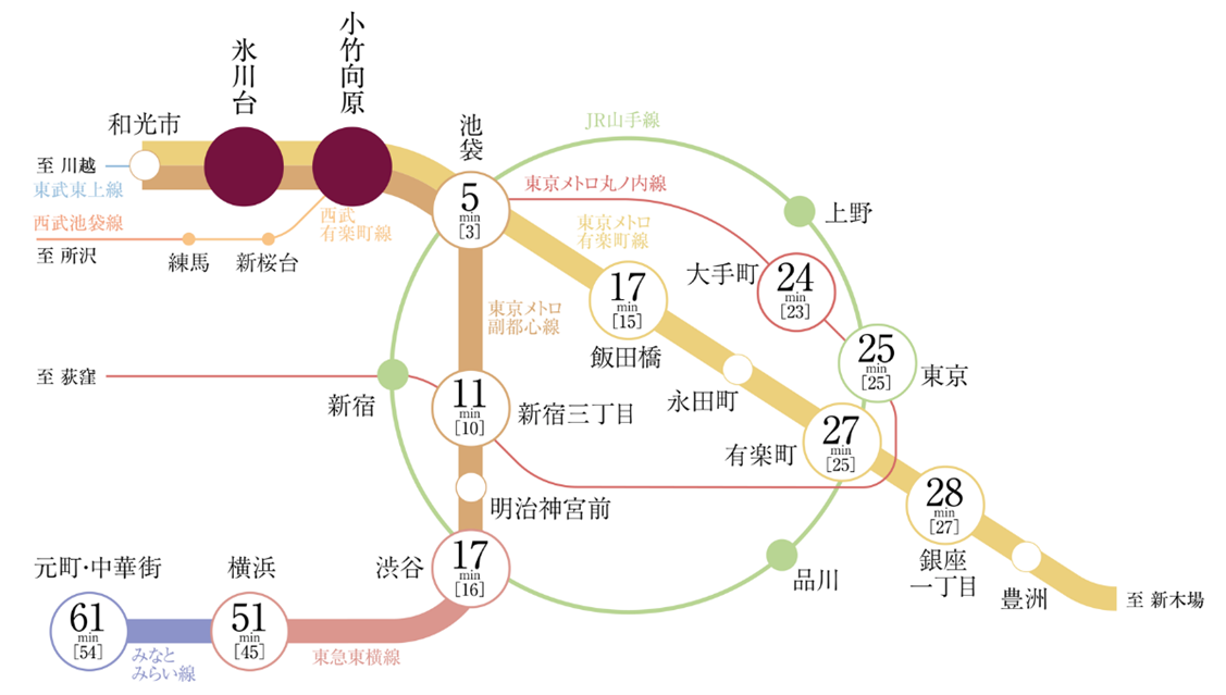 ※1:「小竹向原」駅より東京メトロ副都心線通勤急行利用、掲載の電車所要時間は通勤時(7:00〜9:00)のもので、時間帯や交通状況により異なります。また、乗換え・待ち時間を含みます。(2023年3月現在)