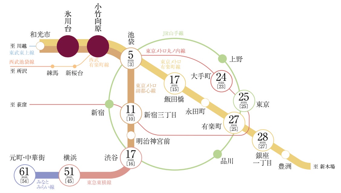 ※所要時間は「小竹向原」駅より通勤時(7:00~9:00)、[ ]内は 日中平常時の目安であり、時間帯により多少異なります。また、待ち時間・乗り換え時間を含みます。※掲載の所要時間は2023年3月現在のものです。ダイヤ改正等により変更になる場合がございます。