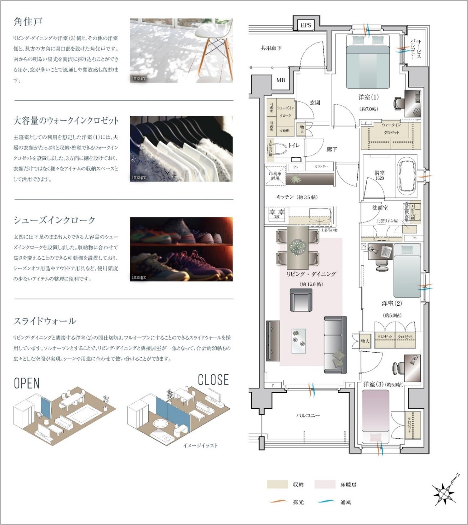 全戸南東向き・南西向きで、明るさと開放感あふれる居住空間となるよう設計しました。幅広いご家族に、いつまでも快適にお住まいいただけるよう、70㎡超の広さを確保した住戸を中心にプランニングし、ワイドリビング、専用庭付き住戸、80㎡超の角住戸など、様々なプランをご用意しました。また、リビング・ダイニングと隣接する居室の間仕切りには、フルオープンにすることのできるスライドウォールを一部住戸に採用。シーンや用途、家族構成の変化に合わせて柔軟に間取りをアレンジすることができます。