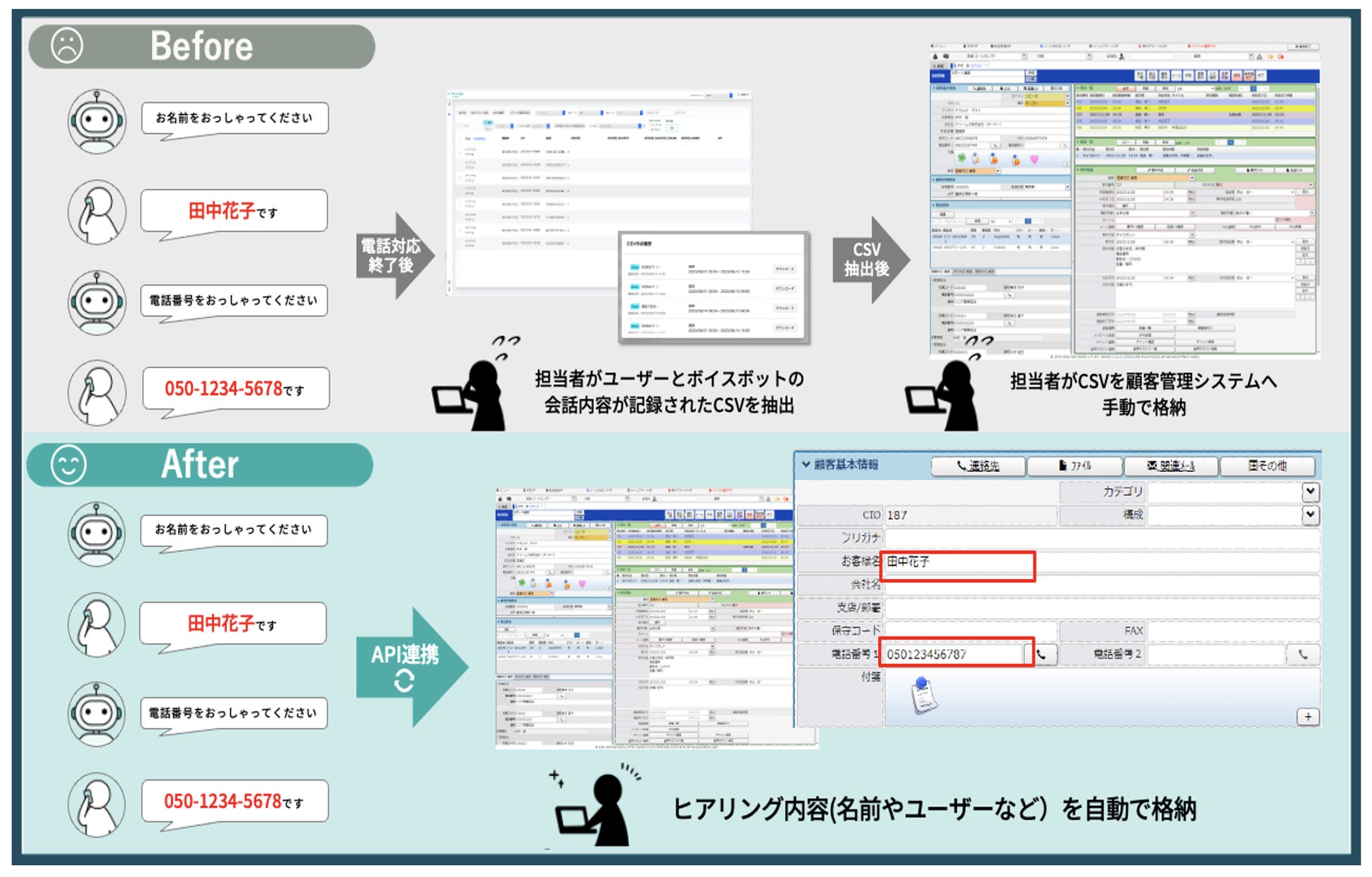 本連携により、ボイスボットが顧客にヒアリングした生年月日や郵便番号などの情報を、「デコールCC.CRM」に格納されている顧客情報と自動で照合ができるようになります。さらに、ヒアリングした情報は、「デコールCC.CRM」へ自動格納できるようになり、有人のオペレーターを介することなく、ボイスボットのみで電話応対業務を完結することができます。