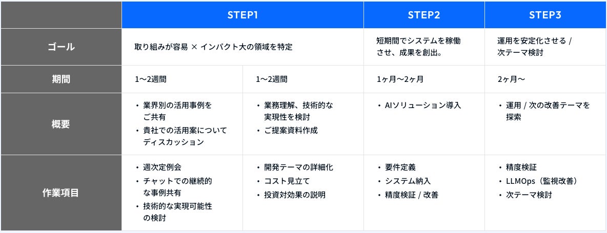 そのようなAI導入前後のギャップを埋めるために、「低リスクかつクイックな成果創出」にこだわるサービスを提供させていただくに至りました。