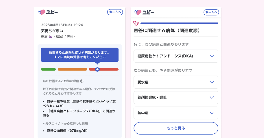今回のヘルスコネクトと症状検索エンジン「ユビー」の連携では、ユーザー同意の元、さまざまな健康に関するデータを他のアプリから取得し、症例検索での質問の精度を向上することが可能となります。例えば、定期的な血糖測定を行っている糖尿病患者さんが「気持ちが悪い」という自覚症状について「ユビー」で検索した場合、他のアプリから取得した血糖値のデータを基にAIの質問精度が向上します(*)。よりリスクの高い疾患との関連がある場合には、適切な医療機関を案内するなど、適切な受診行動を支援します。また今後は、同じくユーザー同意のもと、他のアプリからバイタルデータを取得した上で症状検索を実施すると、連携医療機関へ症状検索結果と併せて取得したデータを送信することを検討しています。これにより医療機関は、定量的データを含めたより多くの情報を得た上で診療にのぞむことができるようになります。