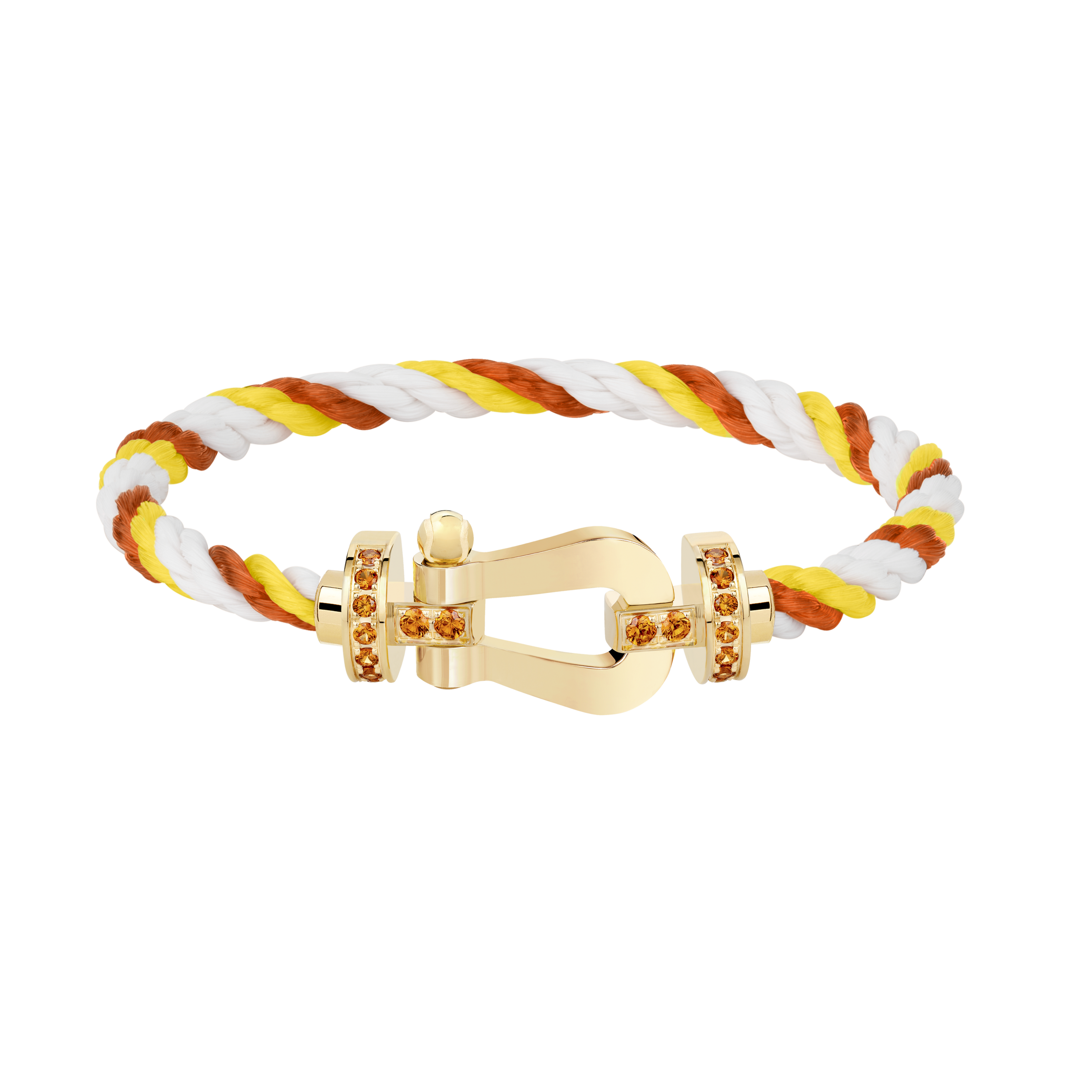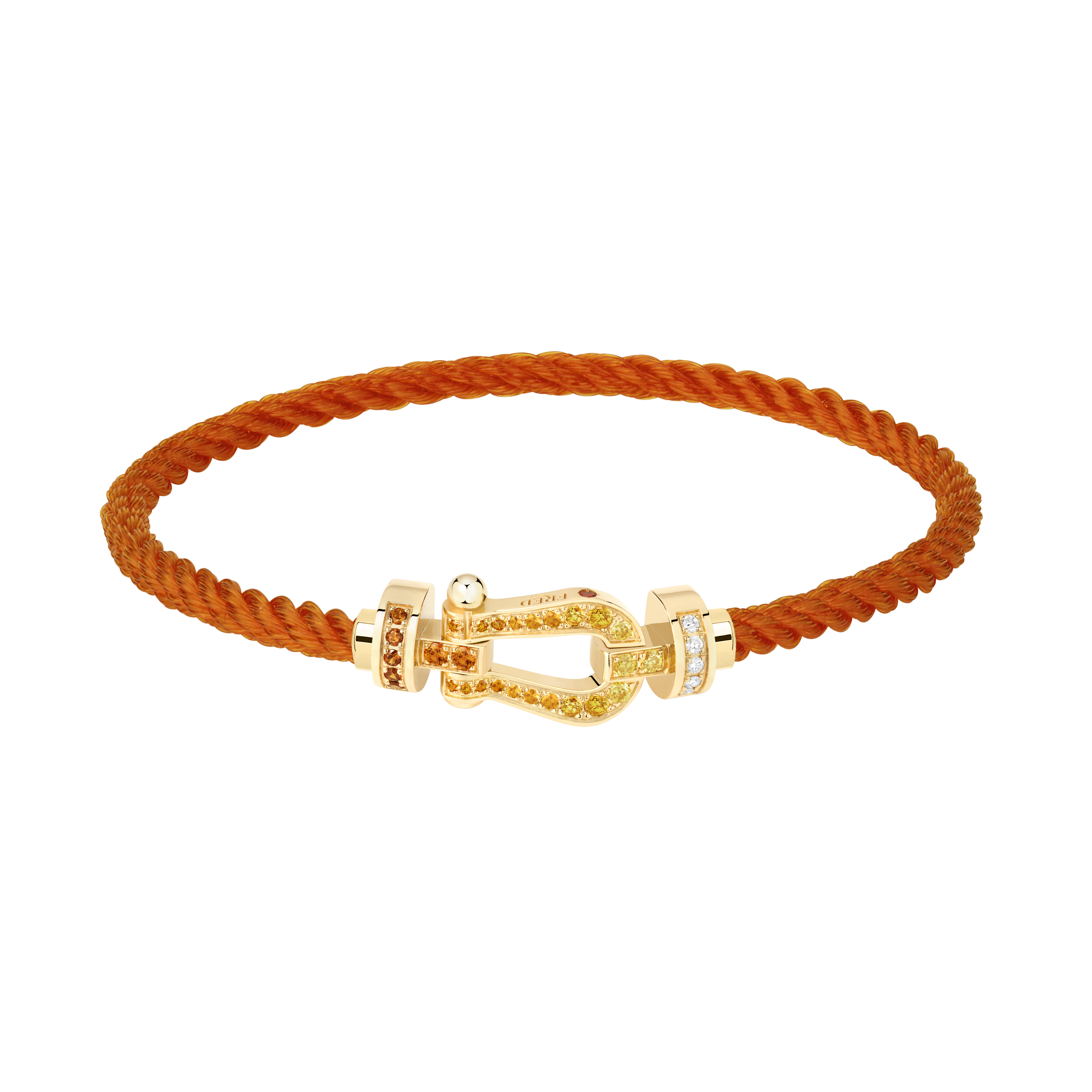 ローラン・ギャロストーナメントという伝統的なイベントに敬意を表し、フォース10ブレスレットのジェンダーレスで交換可能な5つのバリエーションを発表します。トーナメントのシグネチャーカラーとコードが、フレッドのカジュアルでシックなエレガンスを完璧に引き立てます。バックルはイエローゴールドで3つのモデルが登場。ラージモデルは、クレーの黄土色にインスパイアされたマンダリンガーネットがパヴェセッティングされ、サイドのデザインにはテニスボールを象徴するエングレービングが施されています。ミディアムモデルは洗練されたエレガンスを体現し、ホワイトダイヤモンドとイエローダイヤモンド、そして太陽のような色合いのカラーストーンがグラデーションを形成しています。