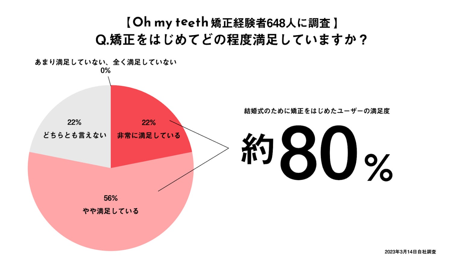 忙しい結婚準備中でも無理なく続けられる、通わないマウスピース矯正を提供するOh my teeth。Oh my teeth矯正経験者648人に満足度を調査しました。その結果、結婚式のために矯正をはじめたユーザーの満足度は「非常に満足している」22%、「やや満足している」56%、「どちらとも言えない」22%、そして「あまり満足していない」と「全く満足してない」が0%と高い満足度が明らかになりました。