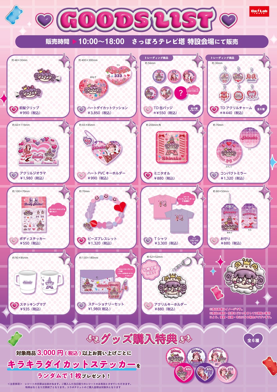 「さっぽろテレビ塔特設会場」では、しなこの撮り下ろされた写真と新規イラストを使用した限定コラボグッズを販売致します。(全15アイテム25種類)本イベントでしか手に入らないエリア限定デザインのグッズも販売いたします。開催期間中は1会計3,000円(税込)ご購入毎に、【キラキラ大カットステッカー】1枚をプレゼントいたします。