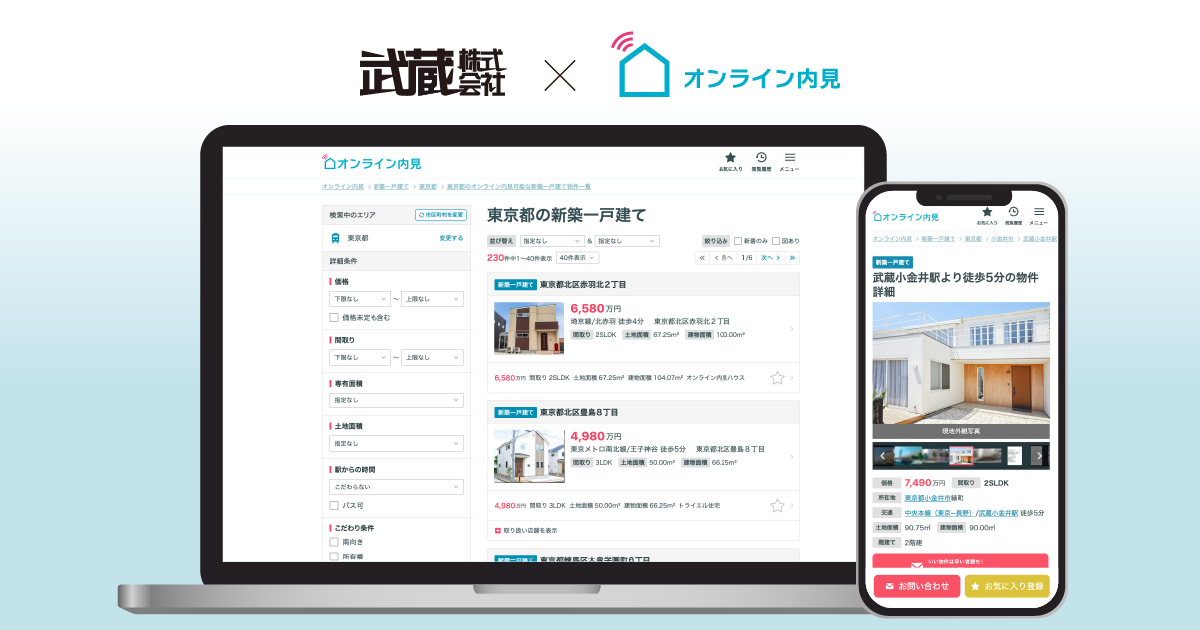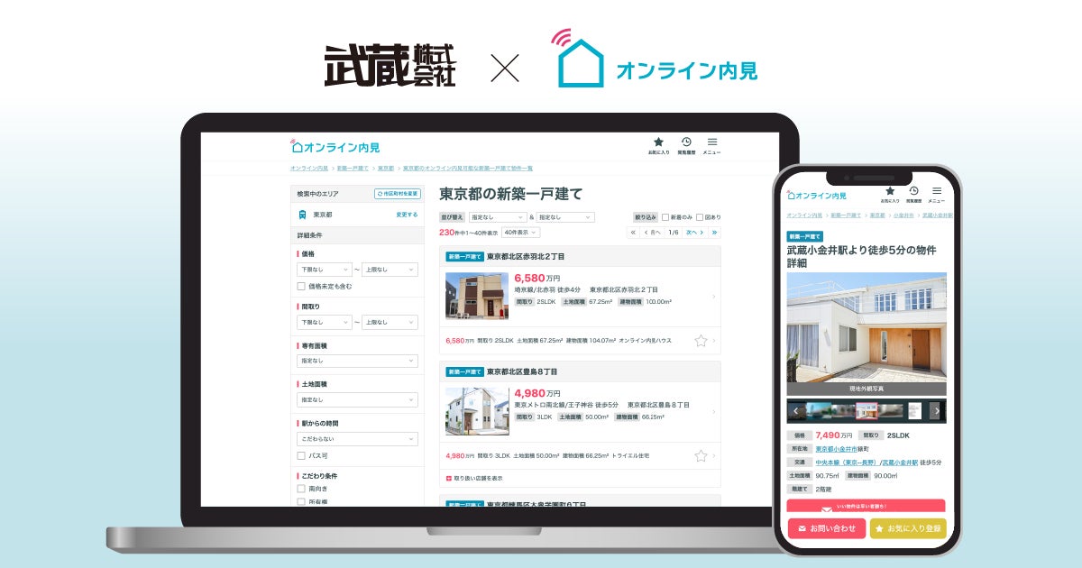 今回の取り組みは、売買仲介用物件管理システムを開発する武蔵株式会社(本社:東京都港区、代表取締役:上羽 健介、以下「武蔵」)とのデータ連携によるもので、本連携により、ユーザーは「オンライン内見情報サイト」にて、新築一戸建てのオンライン相談/内見/IT重説対応可能物件を一括して検索することができるようになります。