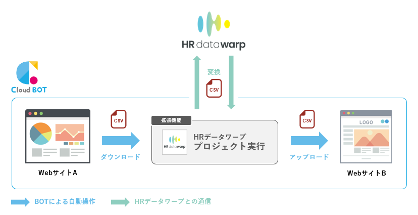WebサイトAから取得したCSVファイルを拡張機能「HRデータワープ/プロジェクト実行」を用いて変換し、WebサイトBにアップロードするという一連の流れを自動化できます。