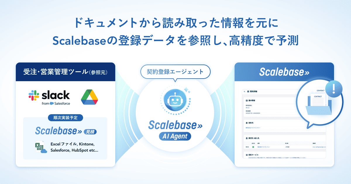 法人向け収益管理システムを提供するScalebase株式会社(本社:東京都港区、代表取締役CEO:毛利 悠記、以下、Scalebase)は、生成AIを活用した新ブランド「Scalebase AI Agent」を立ち上げ、その第一弾として、営業書面からのデータ入力を自動化するツール「契約登録エージェント」の提供を開始いたします。