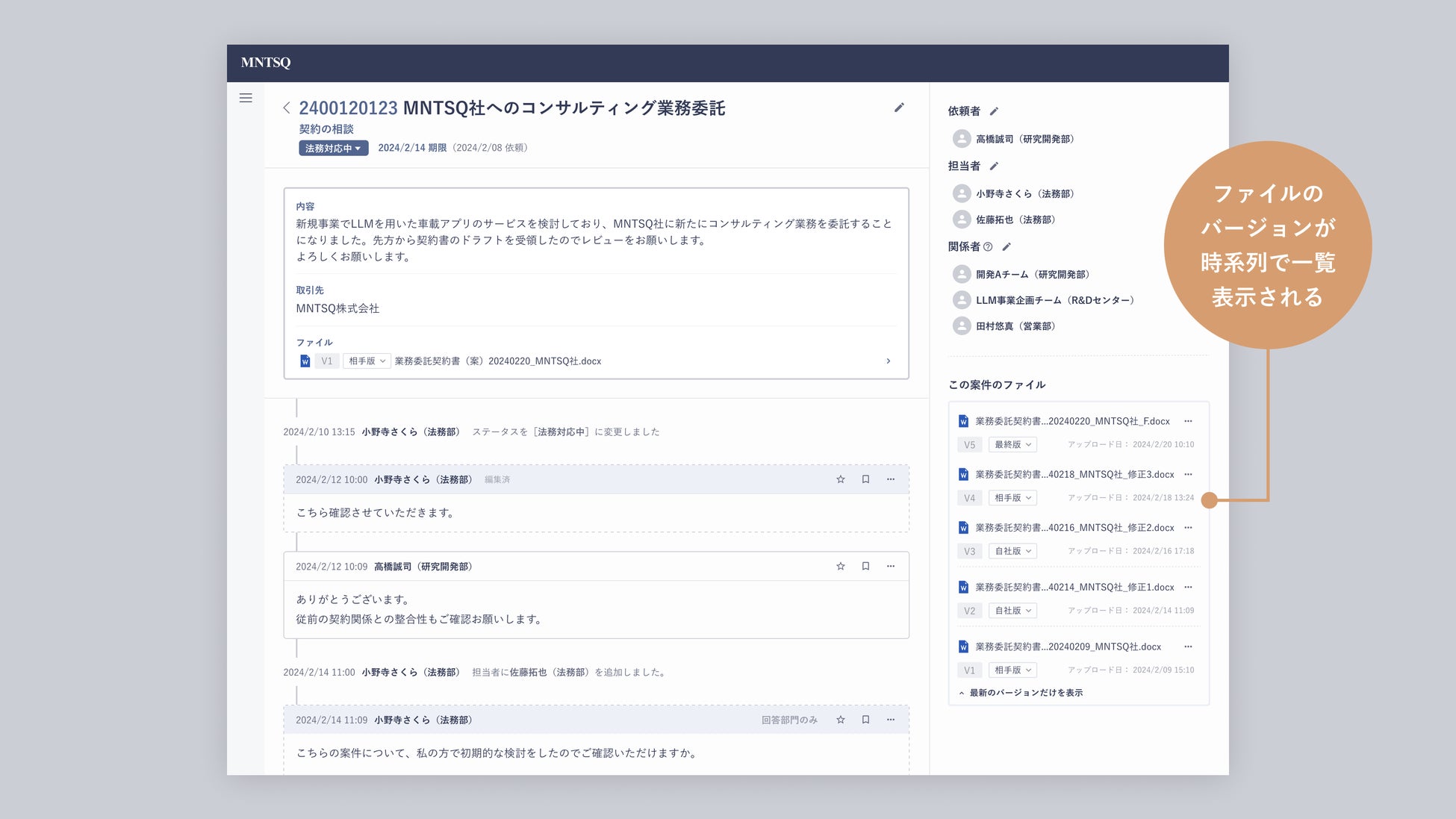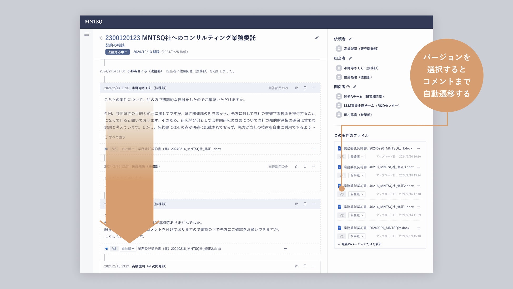 今回の機能追加は、契約書の審査・交渉段階や事前の法務相談の段階において、「MNTSQ 案件管理」にアップロード・集約されるdocx形式のファイルが、自動的に整理されバージョン管理されるようになるものです。*