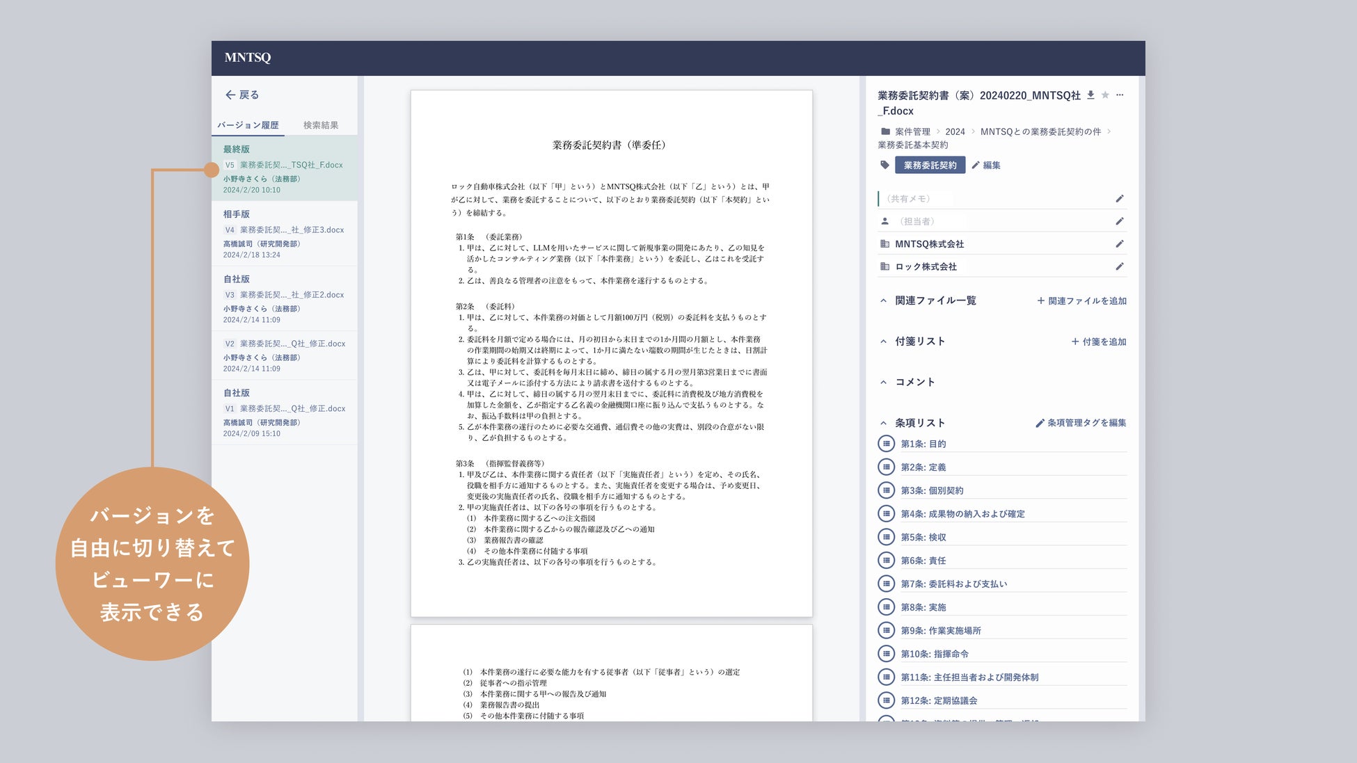 これらにより、目的のファイルを探し回らなくても各バージョンに簡単にアクセスできるようになり、また当該ファイルがアップロードされた際のコメントにも即座にアクセスできるようになるため、審査・交渉経緯を把握しやすくなります。