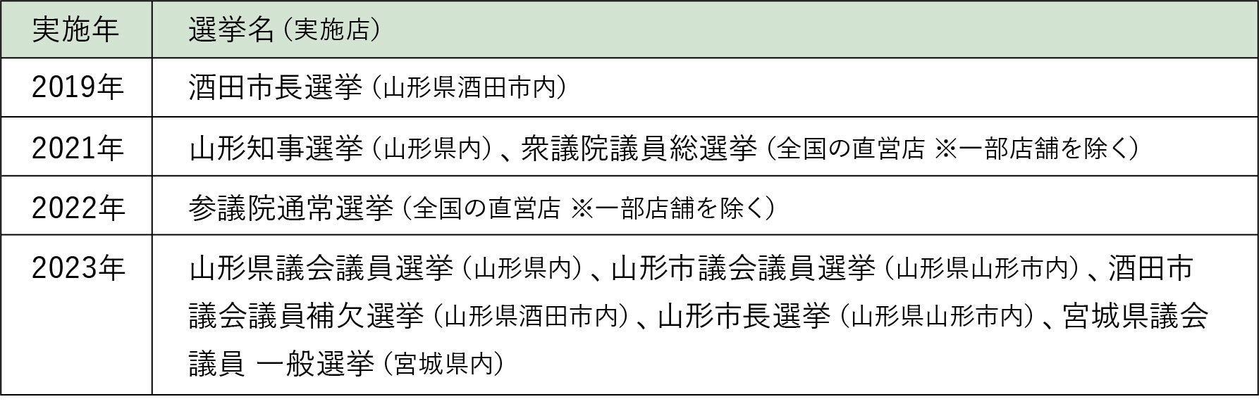 選挙割りは、若者の投票率向上や社会参加意識の向上を願い、投票の際に受け取ることができる「投票済証」を飲食店等で提示することで、サービスを受けられるもので、近年社会的にも注目され全国に広がりを見せています。当社では、2019年8月の酒田市長選挙(山形県酒田市内のみ)より実施し、今回で10回目となります。未来を生きる全国の若者が、自らの将来を考え、投票するきっかけになることを祈念し、若者の投票行動を応援いたします。
