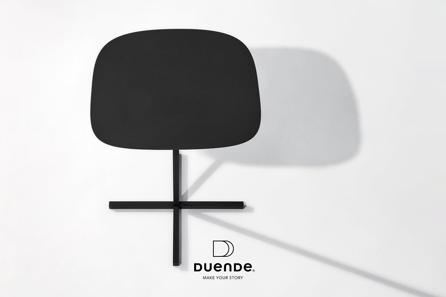 十字にクロスしたベースから真っ直ぐ角棒が伸び、天板を固定するフレームの形状は、つなぎ目がほぼ見当たらないシンプルな構造が目を疑うほど美しく、これは加工技術の精度の高さはもちろん、スチール無垢材の重量を力学的に検討することで、ソリッドな仕上がりになっています。また、そこに乗せられたおおらかな輪郭の天板は、前後(*位置により、もしくは左右)のカーブの形状が微妙に異なり、緩急ついた曲線の有機的デザインが特徴です。例えばソファの横にノートパソコンを置きたい時には角のある方を手前にしたいでしょうし、壁沿いに花瓶を置くのに使う時は丸く緩いカーブを手前にしたら奥行き感が出ることでしょう。無機質で決まりきった形ではなく、やわらかな弧を描くことで、あらゆるシーンで使いやすいサイドテーブルに仕立てております。そのプレートに置かれた “モノ” は、まるで空間に浮かび上がるアート作品のよう。空間のサーフェスとなり、皆様の暮らしのなかで紡がれるストーリーを、そっと支えるようなインテリアとなりました。これは、デザインとは自己表現ではなく、あくまでその使われる環境や作法からあるべき姿を写し出されるような客観性をもつといった、ブランドと共通した想いが背景にあります。また、最小限の加工技術で作られたシンプルな構造ですが、運送費や収納面を考慮しスマートなフラットパックとし、組み立て分解が可能、もちろん壊れにくさも実現するという、DUENDEがこれまでの商品開発で培ってきたスチール加工技術を駆使したもので、デザイン感度が高い方にも喜んでいただける商品となっています。GOOD DESIGN AWARDを受賞した『BENT STOOL(ベントスツール)』との組み合わせも相性抜群です。