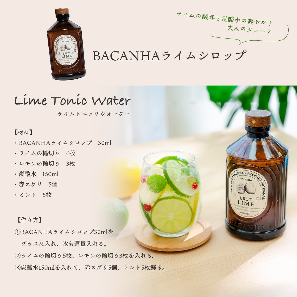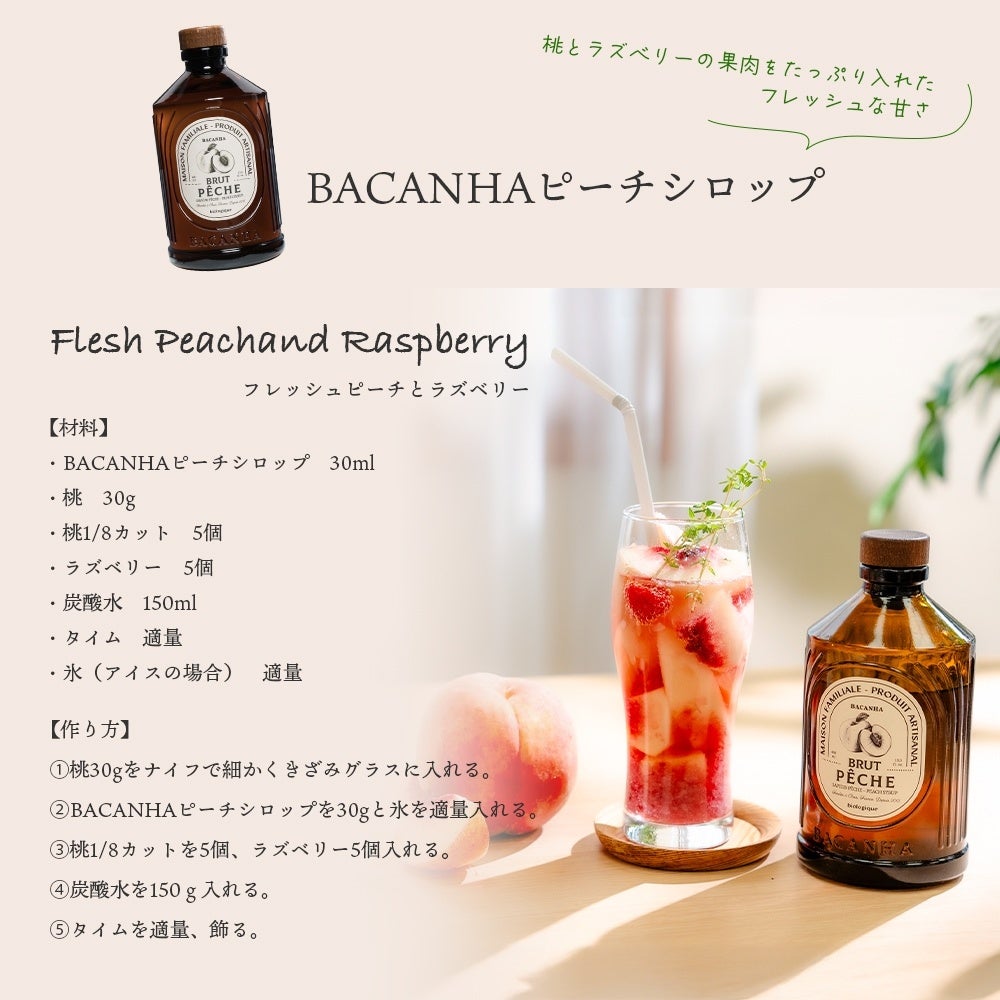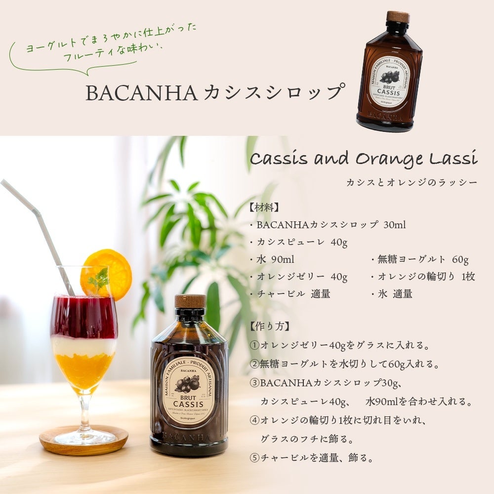 BACANHA(バカンハ)は2013年にパリで誕生したシロップブランドです。フランス語で「生」を意味する「BRUT(ブリュット)」を冠したシロップは、厳選された天然抽出物、エッセンシャルオイル、フルーツジュース、アロマを使用。着色料・保存料を使用せず、奥行きのある味わいと自然な色合いが特徴です。