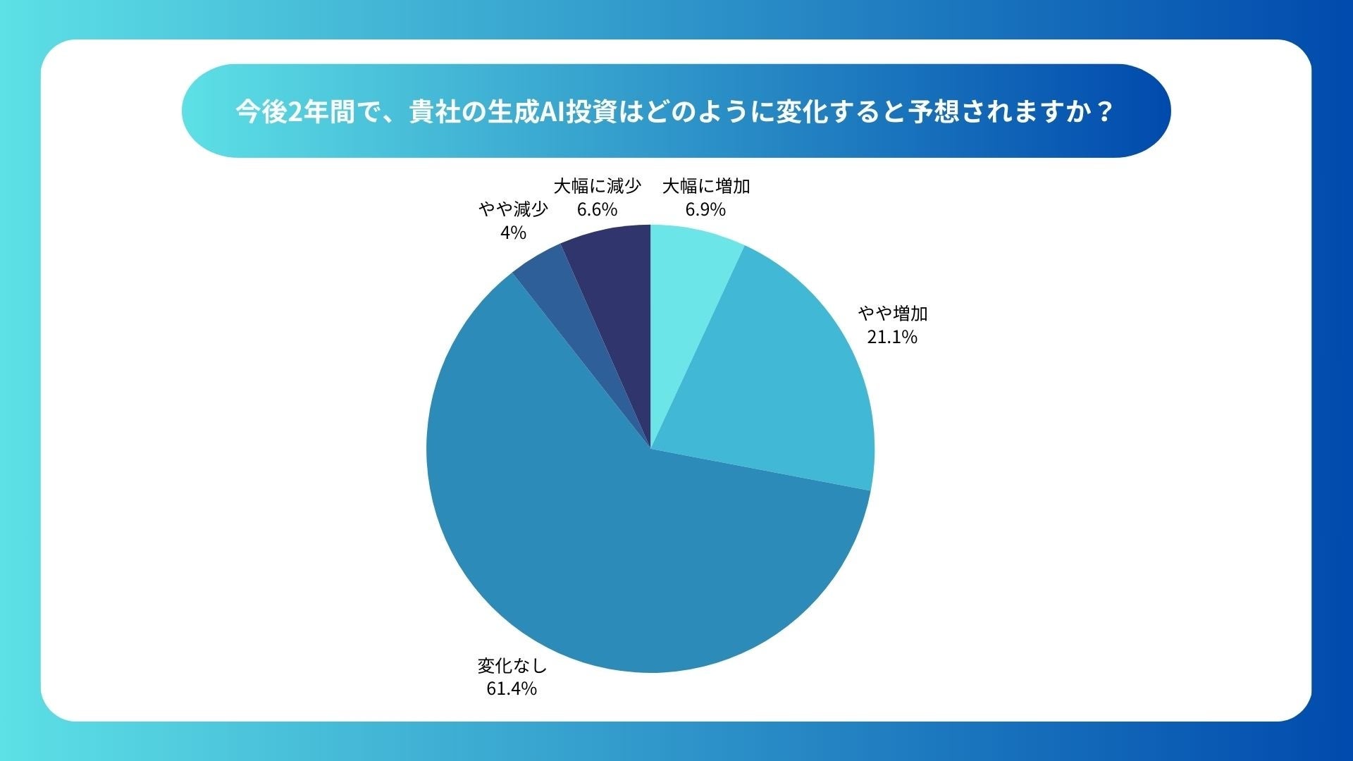 今後2年間で28.0%の企業が生成AI投資を増加させる予定であるのに対し、61.4%が変化なしと回答しています。この結果は、多くの企業が様子見の姿勢を取っている一方で、約3分の1の企業が積極的な姿勢を示していることを意味します。この先駆的な企業群の成功事例が、他の企業の導入判断に大きな影響を与える可能性があります。 -