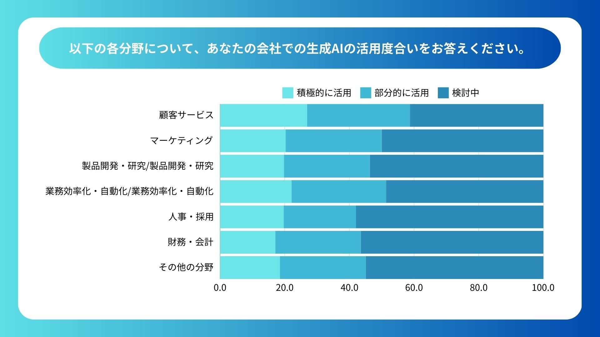 顧客サービス(13.1%)と業務効率化・自動化(11.6%)の分野で比較的高い活用率が見られます。これは、これらの分野が生成AIの即時的な効果を得やすい領域であることを示唆しています。一方で、人事・採用(7.9%)や財務・会計(8.4%)での活用率が低いのは、これらの分野でのAI活用にはより慎重なアプローチが必要とされているためと考えられます。 -