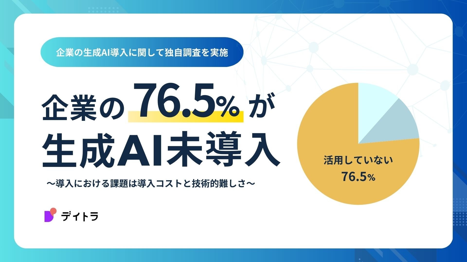 株式会社デイトラ(所在地:東京都豊島区、代表取締役:大滝昇平、以下「デイトラ」)は、企業における生成AI導入の現状を把握し、導入の妨げとなっている原因を特定するため、インターネット上で1,447名を対象に調査を実施しました。調査結果から、現在企業の76.5%が生成AIを活用していないことが明らかになり、導入に向けた課題として導入コストや技術的な難しさが主な障壁となっていることが判明しました。