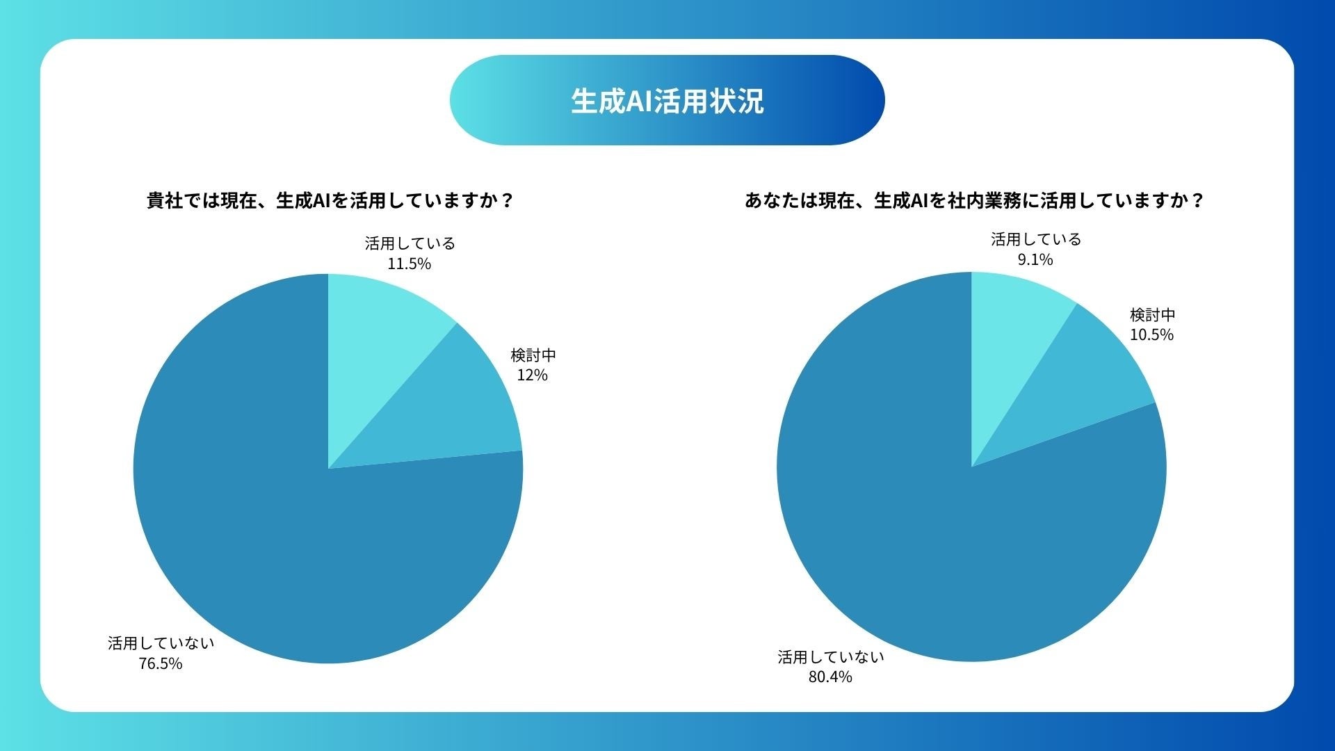 企業の76.5%、個人レベルでは80.4%が生成AIを活用していないという結果は、多くの企業がまだ導入段階にないことを示しています。一方で、企業レベルで23.5%(活用中11.5% + 検討中12.0%)が何らかの形で生成AIに取り組んでいることは、今後の成長の可能性を示唆しています。 -