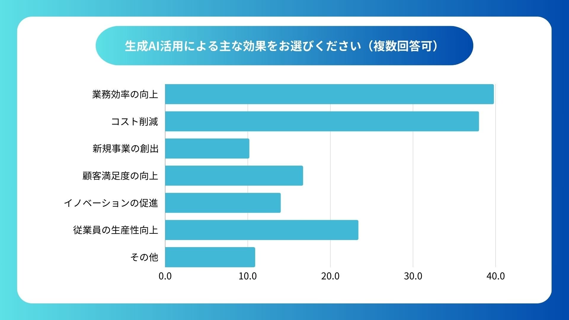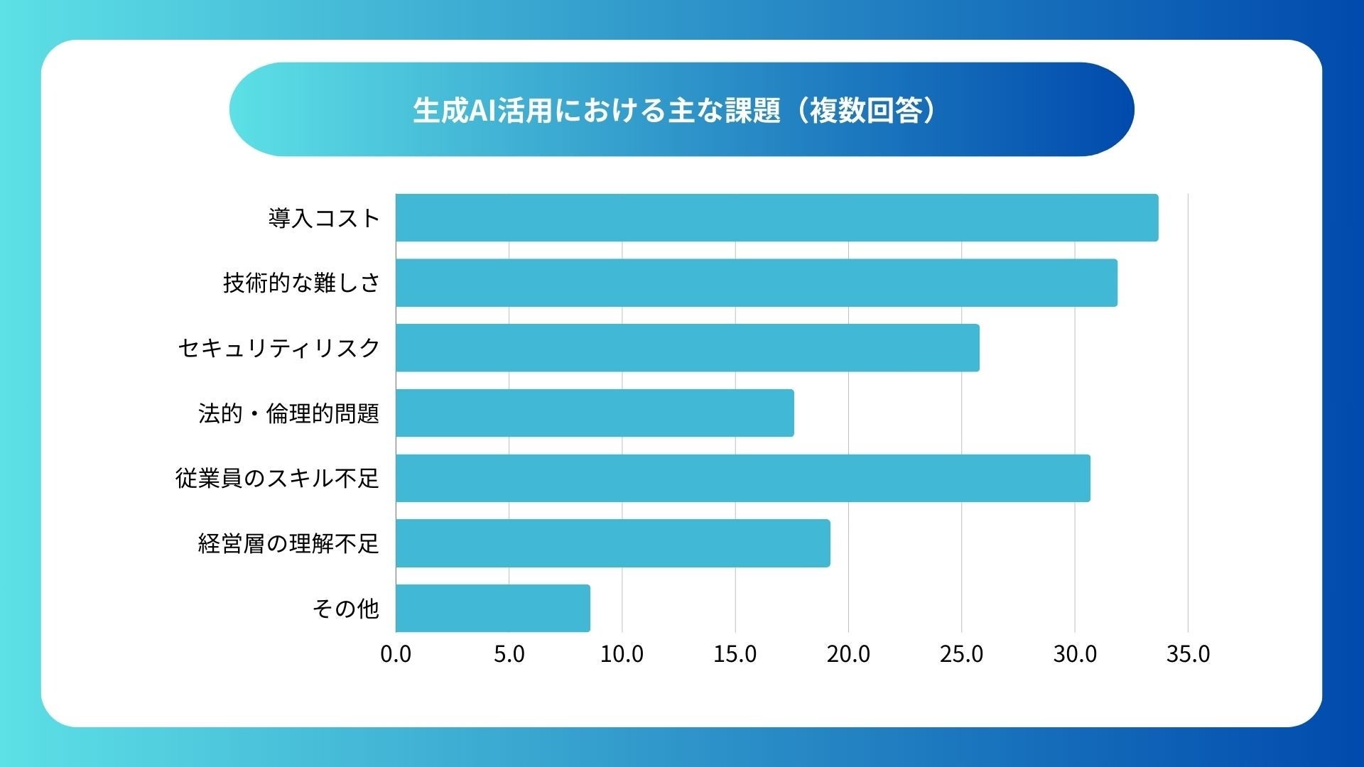 生成AI活用による主な効果として、業務効率の向上(39.8%)とコスト削減(38.0%)が挙げられています。しかし、同時に導入コスト(33.7%)と技術的な難しさ(31.9%)が主な課題として指摘されています。この結果は、生成AIの潜在的な利点と実際の導入障壁がほぼ拮抗していることを示しており、多くの企業が導入の判断に迷っている状況を反映しています。 -