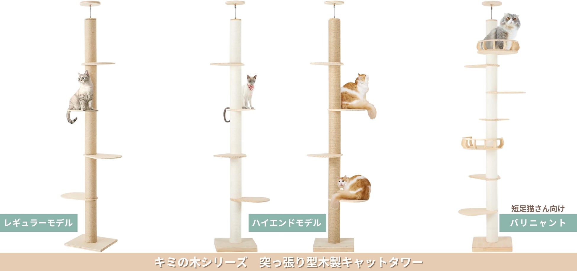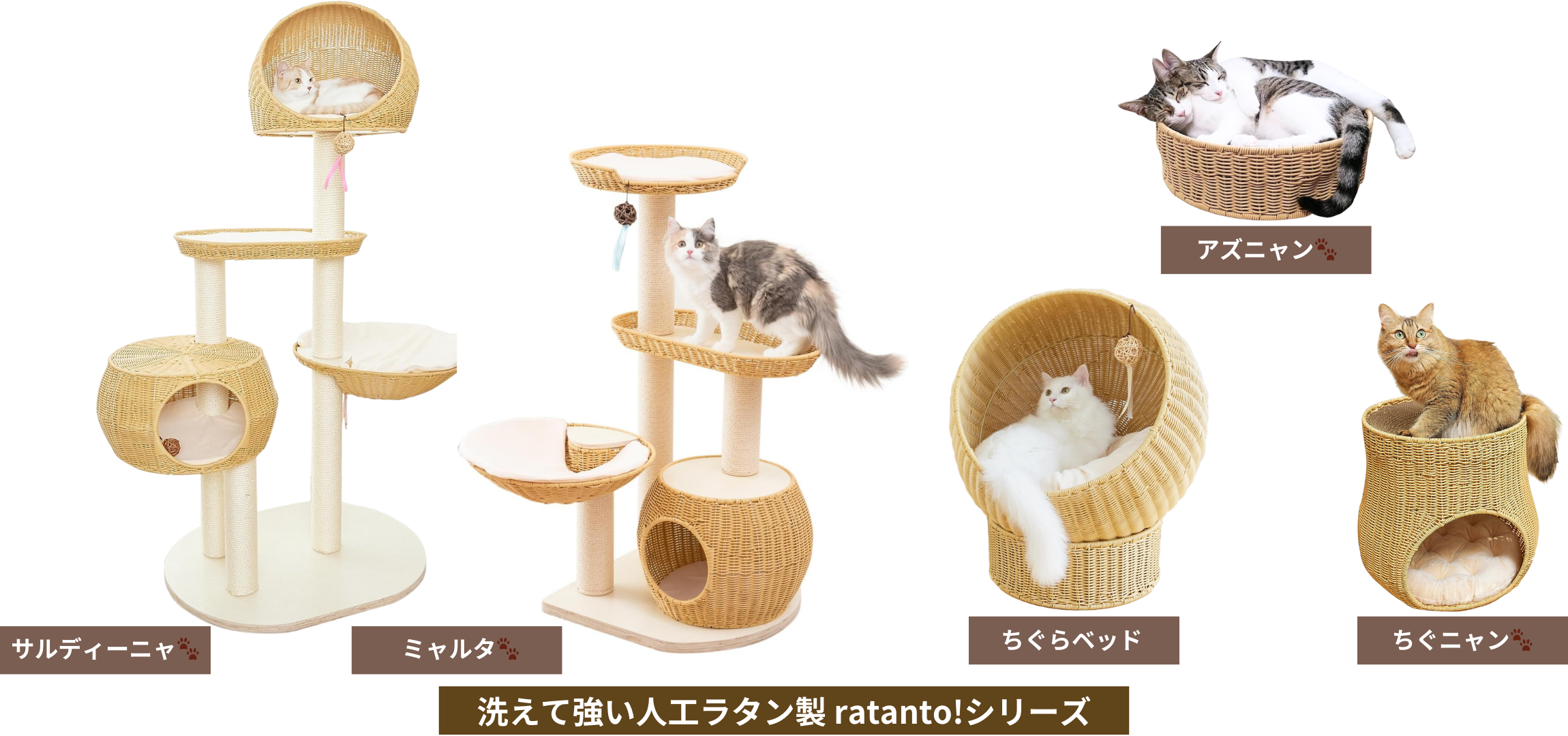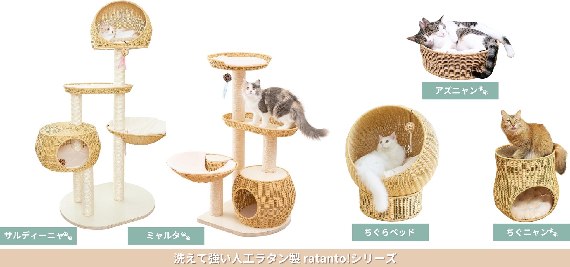2021年の発売当初から大人気の突っ張り型木製キャットタワーを中心とした「キミの木シリーズ」、洗えて丈夫な人工ラタンの「ratanto!シリーズ」をはじめ、2023年8月には猫ちゃんと"もしも"に備える「そにゃエール!」シリーズも登場。