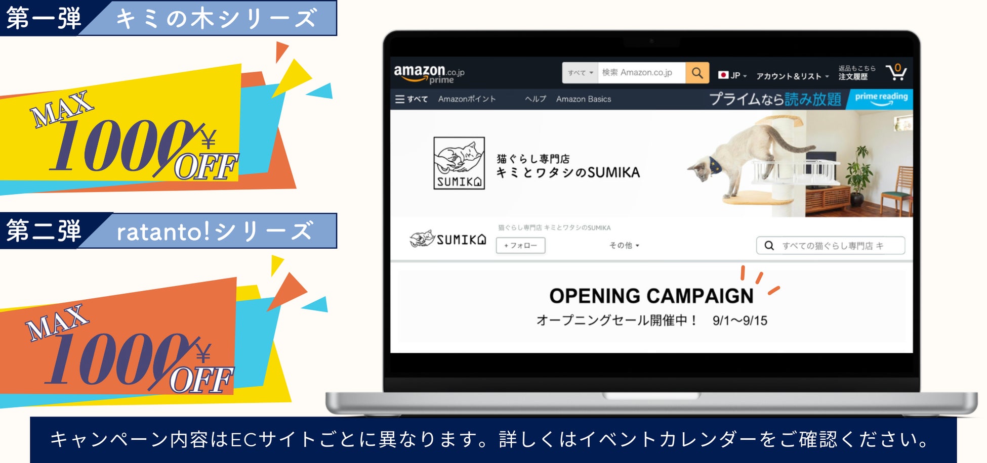 Amazonでは9月1日から15日までは大人気のキャットタワー「キミの木シリーズ」が、後半16日から30日までは「ratanto!シリーズ」が"最大1000円OFF"に!