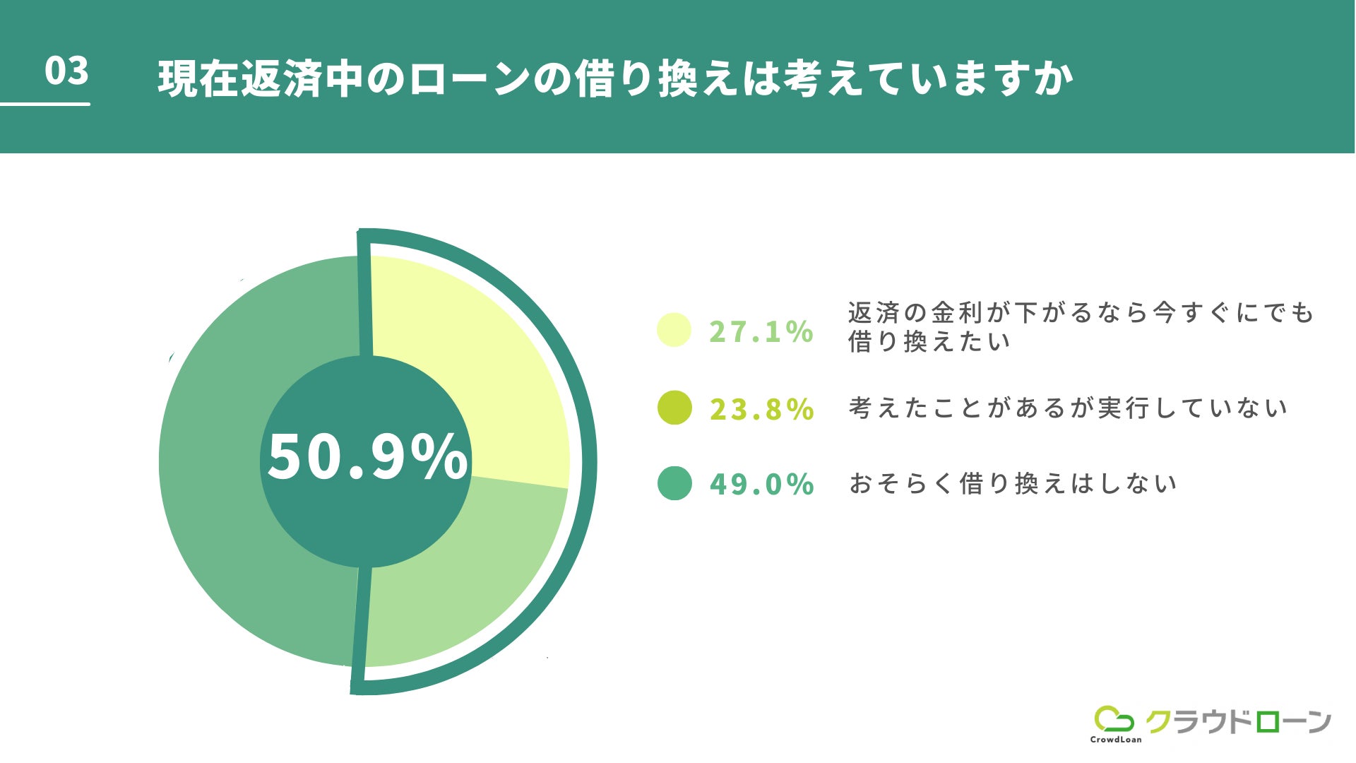 「現在返済中のローンの借り換えは考えていますか」との設問で、「借り換え」について積極的な層が50%を占める結果となりました。前述の考察で挙げたように、経済状況から借り換えについても積極的な姿勢がうかがえます。