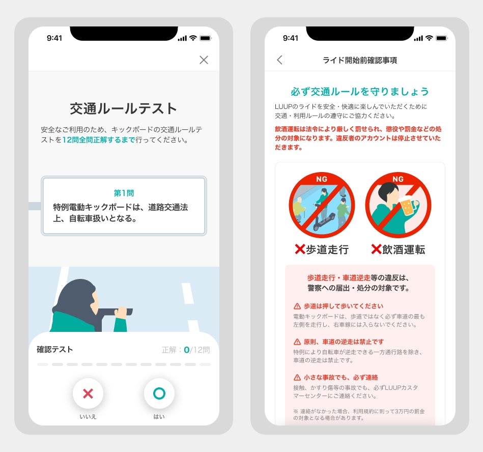 Luup代表の岡井氏は電動キックボード事業者業界団体「マイクロモビリティ推進協議会」の会長を務め、関係省庁と連携しています。また、電動マイクロモビリティの安全な普及のために、サービス内で運転免許登録と関係省庁監修の交通ルールテスト全問正解を義務付けており、違反行為に対する厳正な対処や車両のメンテナンス、安全講習会の実施など様々な安全対策に関する取り組みも行っております。