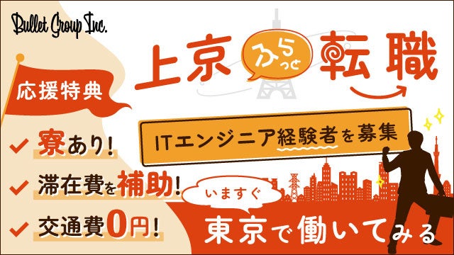バレットグループ株式会社(本社:東京都新宿区、代表取締役:小方 厚、以下バレットグループ)は、ITエンジニアの上京したい想いを後押しする上京転職応援プロジェクト『ITエンジニアの上京ふらっと転職』を展開することを決定いたしました。併せて『ITエンジニアの上京ふらっと転職』特設サイトを本日オープンしましたことをお知らせいたします。