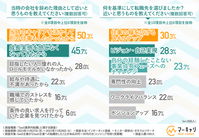 また、市場価値が高まることや将来性、スキルアップにつながると感じたことから転職先もSaaS企業を選んだことがわかりました。