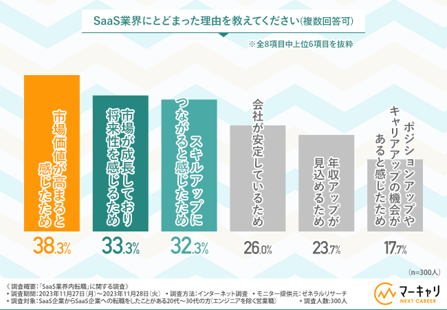 SaaS業界にとどまった理由は、『市場価値が高まると感じたため(38.3%)』や『市場が成長しており将来性を感じるため(33.3%)』であることがわかりました。