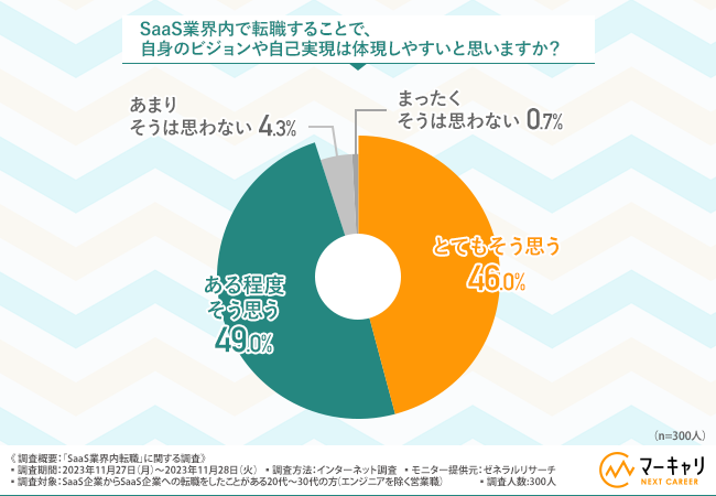 今後のキャリアとして、社員を取りまとめるマネージャーや管理職に挑戦したいと思う方が多く、9割以上の方がSaaS業界内で転職することで自身のビジョンや自己実現ができると思うようです。