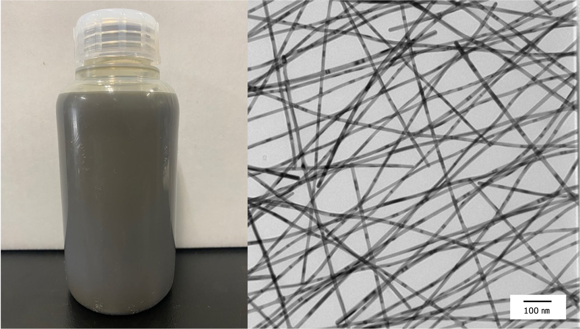 本材料は、マイクロ波化学が独自に開発したマイクロ波プロセス技術を活用して製造される銀ナノワイヤです。マイクロ波加熱を用いることで、反応の均一性や再現性に優れ、高アスペクト比かつ高純度の銀ナノワイヤを効率的に製造できる点が特徴です。銀ナノワイヤは、優れた導電性および透明性を兼ね備えることから、フレキシブルデバイスやタッチパネル、次世代ディスプレイ、太陽電池、ウェアラブル機器など、透明性と高導電性の両立が求められる幅広い分野での応用が期待されています。また、近年は次世代パワーデバイスや高周波デバイスの高度化に伴い、低温プロセス対応や軽量化を可能とする新たな導電材料としての研究開発も進展しており、実装・接続材料分野を含めた応用拡大が期待されています。当社は、本契約により取得した独占的通常実施権を活用し、電子材料分野を中心とした用途開拓および市場展開を推進してまいります。