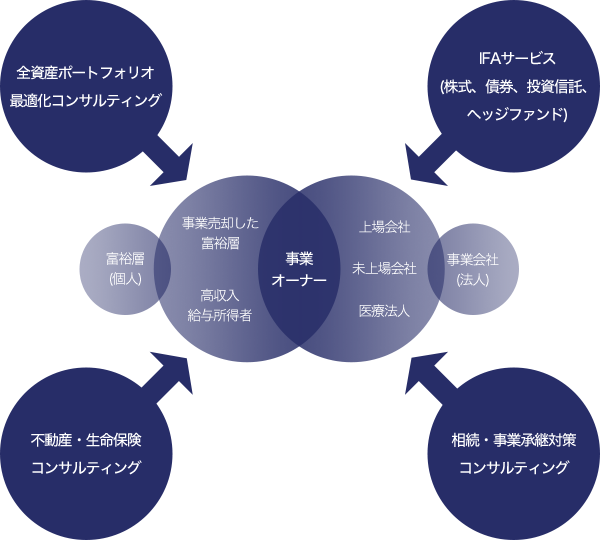 保有資産が1億円以上の富裕層や年収1000万以上の資産形成層に資産コンサルティングサービスを行っております。代表の世古口が日系、米系 、スイス系のプライベートバンクで培った資産管理・保全のノウハウを独自に融合し、全資産に対応した資産ポートフォリオの構築サービスを提供できるのが当社の特徴です。