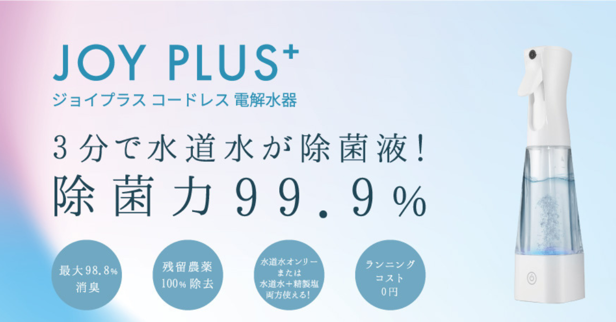 除菌力99.9% ジョイプイラス「コードレス 電解水器」で、手軽に対策!10/19まで!