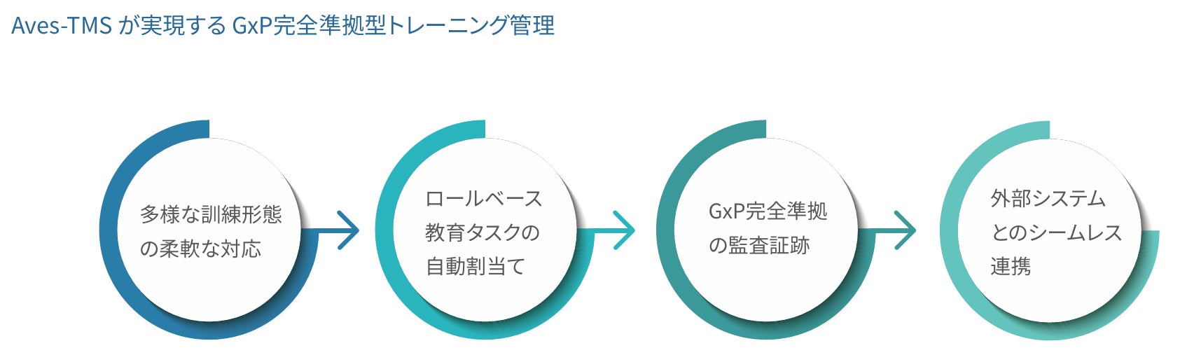 「Aves-TMS」は、GxPおよび21 CFR Part 11、Annex 11など各国の規制要件に対応し、以下の機能を備えた高度なトレーニングマネジメント基盤です。