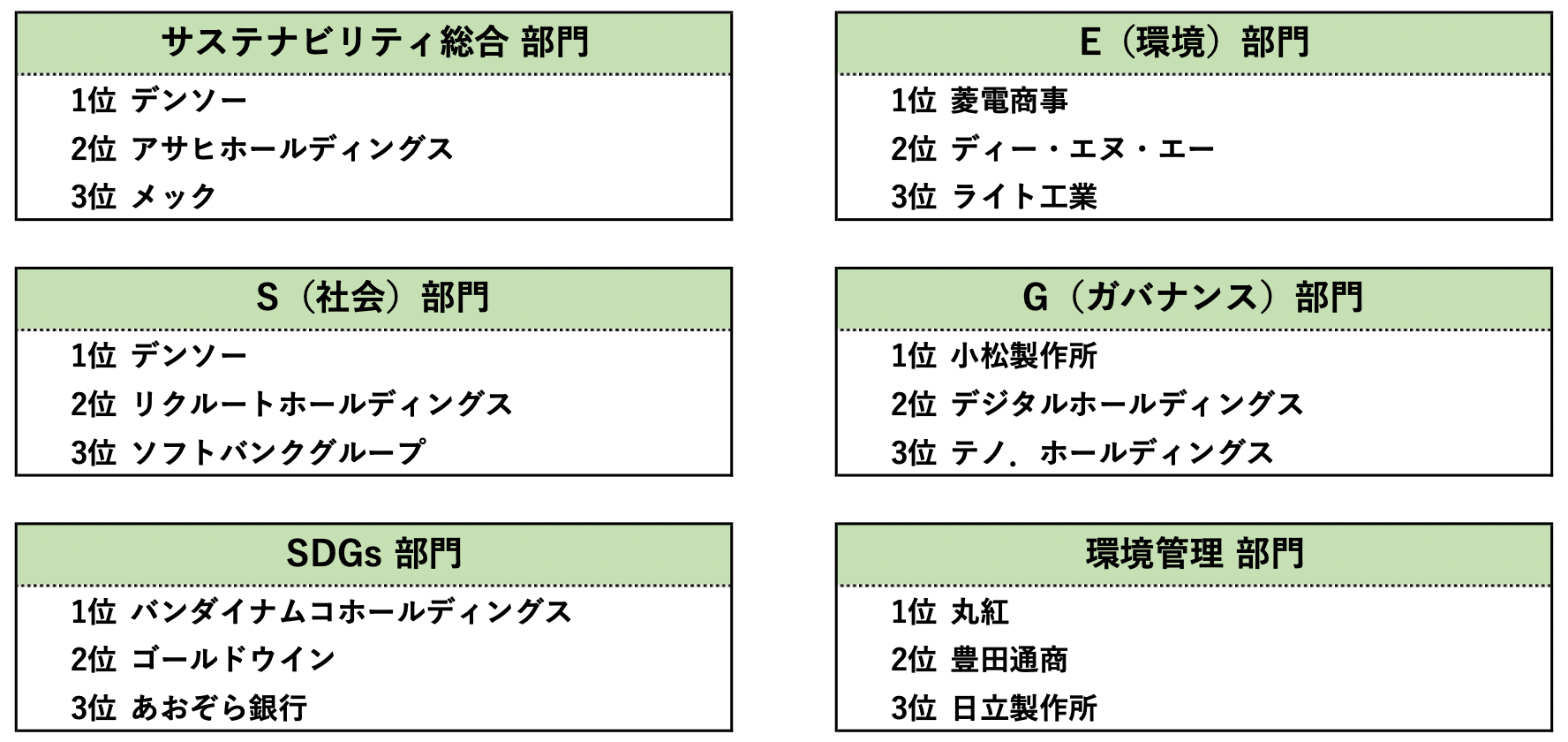 サステナビリティ総合部門の第1位はデンソー、第2位はアサヒホールディングス、第3位はメックとなりました。デンソーは2020年に「環境」領域において2035年までに「CO₂排出実質ゼロ」を目指すカーボンニュートラル宣言をし、2021年にはサステナビリティボンドを発行するなどの取り組みを行っています。また、「サプライヤーサステナビリティガイドライン」を策定し、サプライチェーン全体での社会的責任の実践にも注力しています。