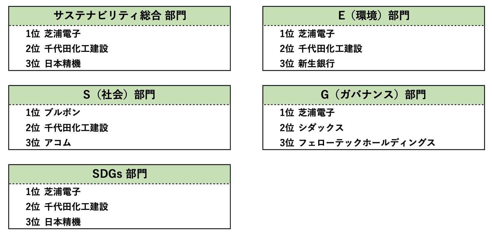 サステナビリティ総合部門の第1位は芝浦電子、第2位は千代田化工建設、第3位は日本精機となりました。これらの企業は、非財務情報の開示が相対的に進んでいたことで、ランキング上位に名を連ねる結果となりました。スタンダード・グロース市場では、非財務情報を適時、適切に開示することが、投資家や求職者などのステークホルダーに支援や共感を訴求しエンゲージする第一歩と言えます。