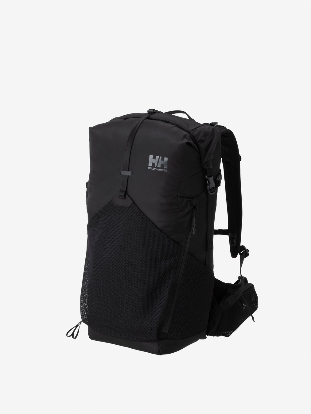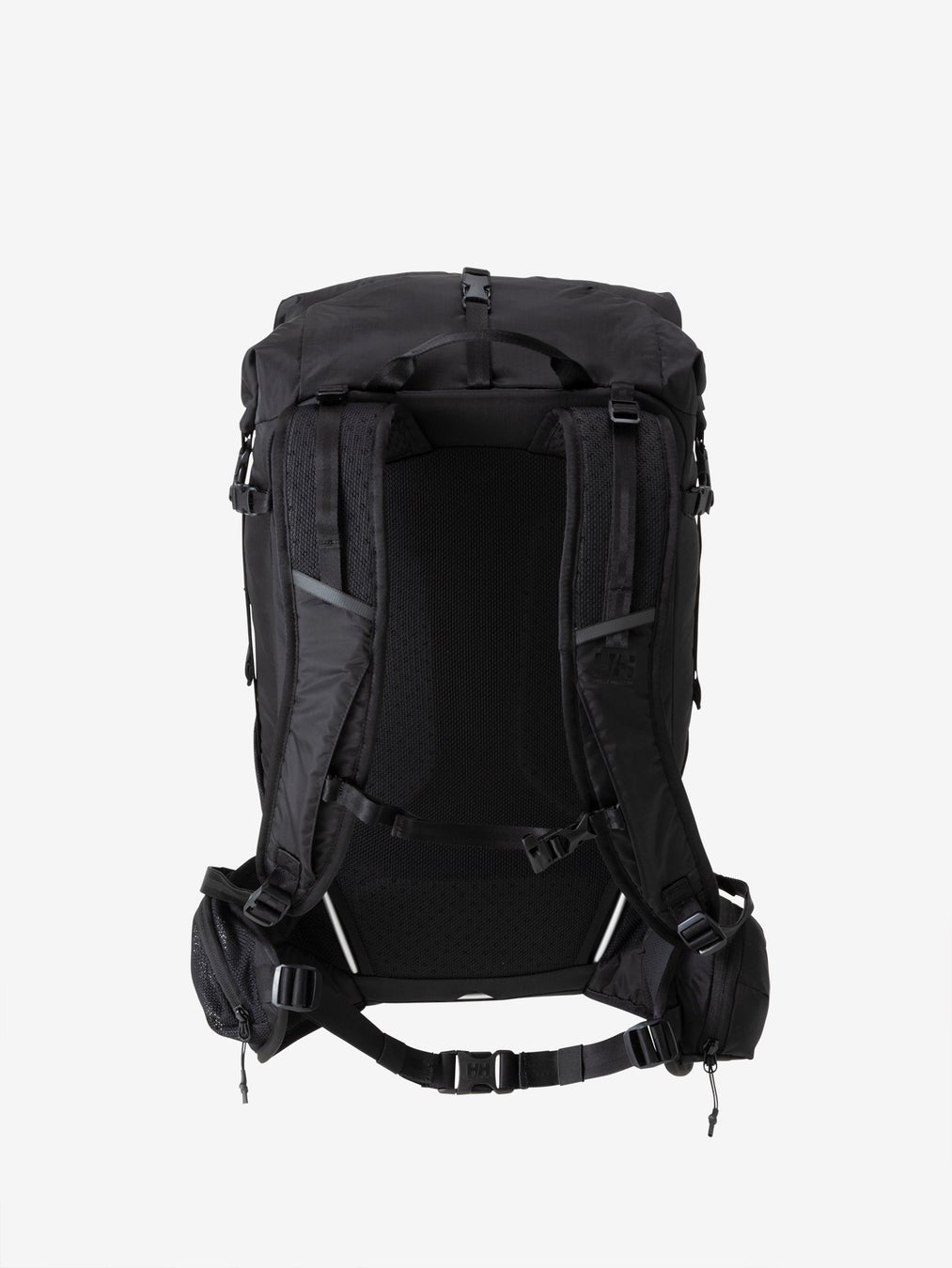 メインコンパートメントはシンプルな一気室で、大きなスリットポケット付きです。トップからはもちろん、サイドファスナーからも内部にアクセスできます。フロントとサイドのポケットは水はけのよいメッシュ構造で、雨や水で濡れたものを簡易的に収納するのに便利な仕様です。ヒップハーネスにはポケットを配しています。