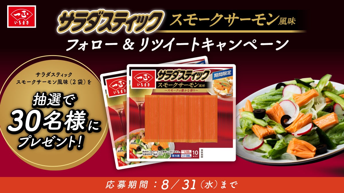 「サラダスティック スモークサーモン風味」の新発売を記念したTwitterキャンペーン。いちまさ(一正蒲鉾)公式Twitterアカウント(@ichimasa_jp)をフォロー&キャンペーン初日に投稿する「#いちまさ #キャンペーン」のついた対象ツイートをリツイートするだけで応募完了!